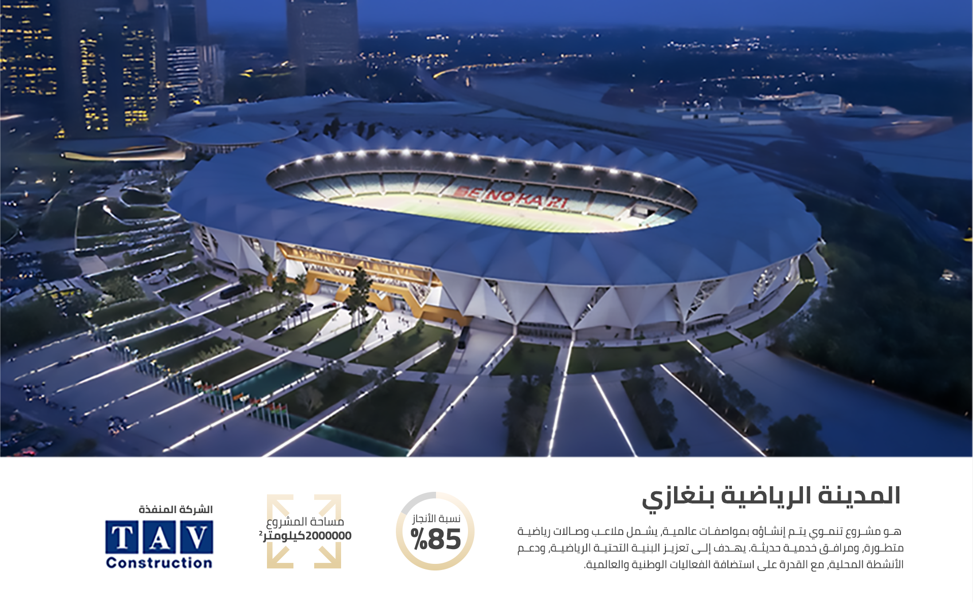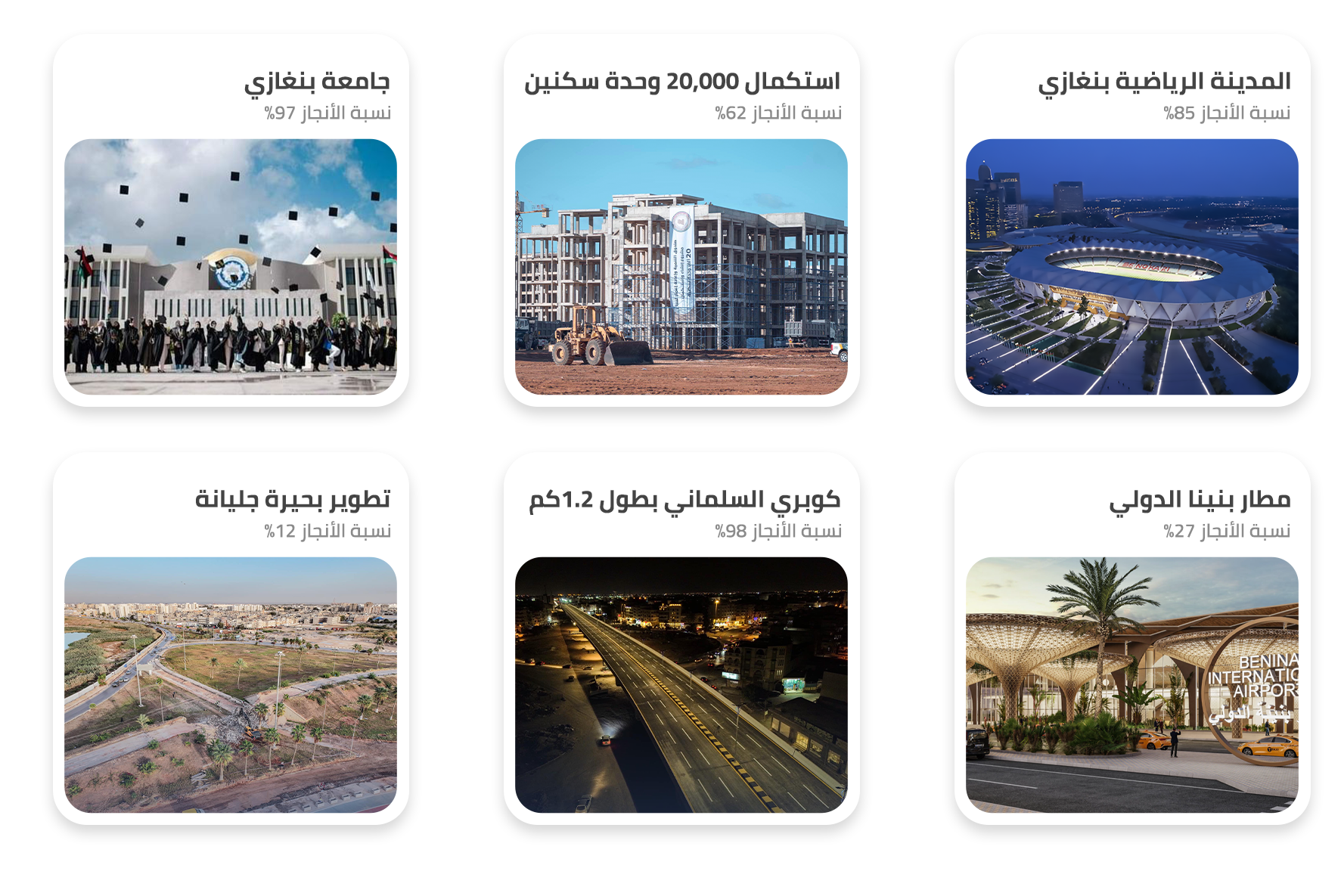 بنغازي ـ600 مشروع ـ480 مشروع مساحة 43,535 كم² سبها مساحة 15,330 كم² ـ940 مشروع درنة مساحة 20.000 كم² البيضاء ـ120 مشروع مساحة 20.000 كم² طبرق ـ78 مشروع مساحة 20.000 كم² ـ480 مشروع المدينة الرياضية بنغازي نسبة الأنجاز 85% نسبة الأنجاز 27% مطار بنغازي الدولي بنغازي ـ600 مشروع مساحة 43,535 كم² سبها مساحة 15,330 كم² ـ943 مشروع درنة مساحة 20.000 كم² البيضاء ـ120 مشروع مساحة 20.000 كم² طبرق ـ78 مشروع مساحة 20.000 كم²